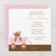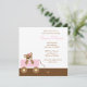 Simply sweet baby shower invitation or new baby birth or adoption announcement features an adorable vector illustration of little brown bear in a toy wagon. Available in blue, pink or green. Custom colours available by request.