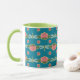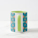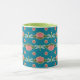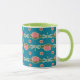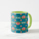 A beautiful white Ringer Mug with a Green Lip and Handle and a pattern of Water Lilies and Dragonflies, from a hand-painted paper collage by Judy Adamson. Excellent gift for someone with a July birthday; Part of the Posh & Painterly 'Lily Pond' collection.