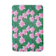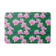Bath mat in a pattern of water lillis in soft shades of pink, and emerald green lily pads, floating on a pond