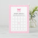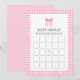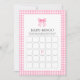Add a fun and interactive element to your baby shower game card with this charming Baby Bingo pink bow design! Featuring a simple coquette bow combined with a pink gingham background. Get your guests to fill in the squares with gifts they think the mum-to-be will receive, then mark them off as she opens her presents. First to get five in a row wins!