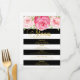 Wedding dinner menu in black and white stripes pattern with pink watercolor vintage flowers and gold text, customisable with your details and available in matching wedding products.