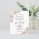 These wedding invitations are elegant and stylish while still being budget friendly and affordable. They feature a rustic boho chic design with hand painted watercolor roses and flowers in shades of blush pink, coral, and mauve, surrounded by eucalyptus leaves and garden greenery. The typography is done in lacy script calligraphy. The back features a bouquet of the same flowers and foliage tied with a white bow on a marbled dusty rose or mauve pink background. Beautiful way to invite your friends and family to share in your special day.