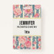 A name tag with a beautiful pattern featuring pretty pink flowers layered over top a striped pattern composed of blue and cream coloured stripes.
