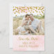 Wedding custom photo save the date announcement card in light pastel blush pink watercolor pattern with glamourous gold confetti. Please note gold is photographic effect only.