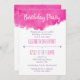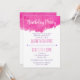 A stylish and trendy birthday party invitation. A cute feminine design using a bright pink watercolor paint splatter.