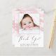 Budget-friendly baby girl thank you birth announcement featuring soft pink watercolor brush strokes overlayed with your newborn's photo and "Thank You" in an elegant contemporary script with a heart swash. Personalise with her full name, arrival date and birth stats in simple modern typography. On the reverse side, add an additional photo and a customised thank you and announcement message.