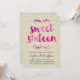 This sweet 16 birthday party invitation features pretty pink watercolor calligraphy that reads "Sweet sixteen." The design also includes floral flourishes and a wood texture background.