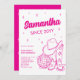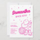 Pink Western Country Disco 25th Birthday Party Invitation features bold pink script text with personalized name, sparkling star accents, and a fun illustration of a stetson, cowboy boots, and disco ball on a white background. It’s perfect for a western or Nashville -themed birthday party. Personalize with her name, party details, and RSVP info. Let’s go girls, it’s time to celebrate!