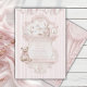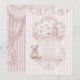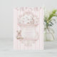 Beautiful pink watercolor whimsical shelf with vintage toys creating a fancy frame surrounding lovely fonts and scripts done in coordinating colors baby shower invite. A pink and white sweet coordinated stripe background with a feminine and elegant look. A perfect baby shower invitation for any season.