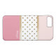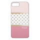 Pretty phone case done in a contemporary modern bold stripe pattern, using blush, white, rose pink, and graphics of gold polka dots and stripes. Personalise the white text with your name or use for a great gift idea for her.