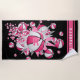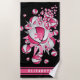 This fun basketball themed beach towel features an "explosion" of varied size pink and white basketballs and grey, pink and white star shapes on a black background - a pattern of tiny white polka dots covers the pink star - customise with the athlete's monogram on the soccer balls graphic and name on vertically orientated pink varsity stripes - by katz_d_zynes