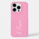 Pink Elegant White Calligraphy Script Custom Personalised Name iPhone 16 Pro Smart Phone Cases features a modern and trendy simple and stylish design with your personalised name in elegant hand written calligraphy script typography on a pink background. Designed by ©Evco Studio www.zazzle.com/store/evcostudio