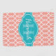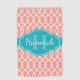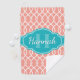 Stylish, trendy blush pink and ogee lattice pattern in the background, topped with a bright teal blue label featuring a customisable name and monogram template.
