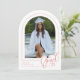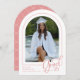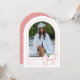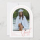 Featuring a chic arch-shaped photo, this announcement perfectly blends soft pink and crisp white tones to create a sophisticated, feminine card. FRONT: "Grad" is shown in a handwritten script and partially overlays the arch-shaped photo. Personalise the template with your grad's photo, first/last names, school name and last two digits of their graduating year. BACK: A geometric pattern with simple hand-drawn bows. © Kimbellished, LLC