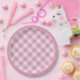The simple geometric design in the background is a pink and white, printed gingham checks pattern with a pink ring around the rim. A great idea for your next party, no matter the event. This design is suitable for all occasions or events including a girls birthday party, baby shower, congratulations, and more.