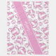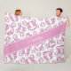 This cool volleyball team colours fleece blanket for girls features a pattern of varied size stylised pink & white volleyballs turned every which way overlying a volleyball net detail graphic - the volleyballs' pink panels are blended with an artsy, girly floral pattern - personalise her name in a sophisticated handwritten font on a bold, angled, full width pink colour strip - background and name strip colours are customisable - by katz_d_zynes