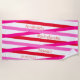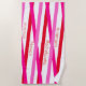 Get the party started with these cute beach towels that are easy to personalise for your bachelorette party, hen night, or girls' weekend! Modern party style design features a geometric pattern with bold pink lettering on a patterned white, pink and red background. Personalise with four lines of custom text; shown with the bride's name, event type, location and date. All text can be edited per your liking.