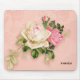 A mouse pad with a floral rose bouquet with white and pink flowers. Background is pink with a floral pattern. Pretty and elegant design.