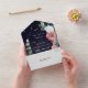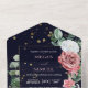This elegant wedding invitation with tear away RSVP card combines stunning watercolor images of pink and white rose bouquets with modern typography. Your text is within a rectangle lined in thin gold, and the floral images with soft green embellishment are around it. A smattering of subtle gold confetti adds a bit of sparkle to the navy blue background. The back flap holds your own special photograph, and the bottom has a matching floral border. The RSVP bottom has plenty of room for your own text, and is easy to customise. We are always happy to help, so feel free to message us if you need assistance. If you're having a buffet reception, we can work with you to re-design the RSVP portion, so don't hesitate to ask!