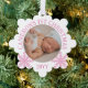 Snowflake shaped photo ornament with a round photo of your baby with curved text and pretty snowflakes in pink and white.