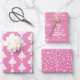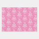 Make your presents stand out with this set of pink and white wrapping paper sheets. The first sheet showcases a design of white Christmas trees on a pink background, while the second sheet is customised with the sender's family name and has festive greetings. The third sheet features white snowflakes against a pink background, making it a perfect addition to the set.