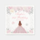 This elegant and glamourous napkin features a beautiful princess with brown hair and fair skin in a pink ball gown. The text combines handwritten script and modern sans serif fonts for a classy and sophisticated look. The floral arrangements, snowflakes and silver confetti create the perfect blend of rustic and chic. Perfect for a winter themed birthday party.