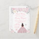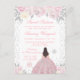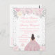 This elegant and glamourous winter sweet sixteen birthday invitation features a beautiful princess with brunette hair and fair skin in a pink ball gown. The text combines handwritten script and modern sans serif fonts for a classy and sophisticated look. The floral arrangements, snowflakes and silver confetti create the perfect blend of rustic and chic.