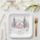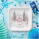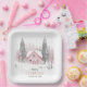 These charming Christmas paper plates feature a soft watercolor illustration of a pink cottage nestled among snowy evergreens and bare winter trees. The elegant "Merry Christmas" greeting is printed in a delicate serif font, adding a cosy and festive touch. Perfect for holiday dinners, parties, and seasonal gatherings, these plates bring charm and style to your festive table settings.
