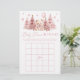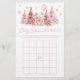 Sophisticated classic "Bingo" game designed for a baby girl shower, adorned with a charming teddy bear wearing a cute pink bow, holding a pink balloon, surrounded by winter pine trees and snowflakes. Engage your guests with this delightful game, perfect for adding fun and excitement to your winter celebration while creating cherished memories.