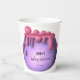 Adorable a baby is brewing Halloween girl baby shower paper cups with an illustration of a witch cauldron bubbling in pink and purple colours. Illustrated and designed by Patricia Alvarez.