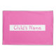Pillow cover for customising a child's bedroom in pink with white lettering (Missy font). Matching accessories include a duvet cover, table lamp, a rug, a ottoman, mouse pad, throw pillow and more. Use the fabric to make custom curtains or pillows.
