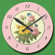 A wall clock with an antique reproduction of pink and yellow roses from vintage botanical artwork by famous artist Pierre Redoute with blue butterflies on a faux parchment background and antique numbers in black on an pink background.