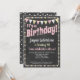 A funky chalkboard pink and yellow birthday invitation featuring chunky text "It's A Birthday!" at the top with chalkboard background, flags and a cute polka-dot border.