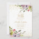 Elegant and colourful pink and yellow watercolor floral with gold glitter on a white 70th birthday party invitation. Contact us for help with customisation or to request matching products.