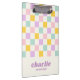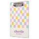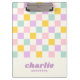 Clipboard featuring a light pink, yellow, purple and aqua blue chequerboard pattern and your name in a retro style, purple font with a line of custom text below. All colours are customisable.