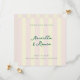 Send modern and on-trend save the date cards with coastal Italy vibes and butter yellow and pale shell pink vertical cabana style stripes. This sleek and chic dark green text is easy to personalize with the basic future wedding details like the couple's names, wedding date, location, and wedding website plus a simple square enfacement photo. This mixes modern sans serif type with a hand-written style script for an elevated but still casual vibe, while the square shape feels unique and upscale.
