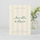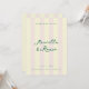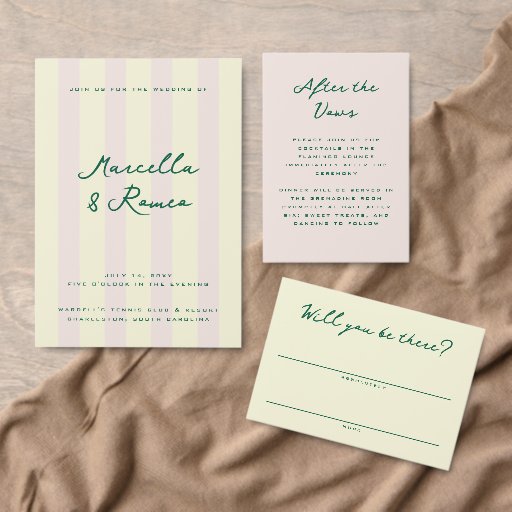 Send modern and on-trend save the date cards with coastal Italy vibes and butter yellow and pale shell pink vertical cabana style stripes. This sleek and chic dark green text is easy to personalize with the basic future wedding details like the couple's names, wedding date, location, and wedding website plus a simple square enfacement photo. This mixes modern sans serif type with a hand-written style script for an elevated but still casual vibe fit for any chic venue, from beach club to tennis club and beyond.