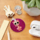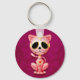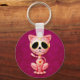 This adorable pink kitten design is decorated with swirls and dot patterns. Flower pedals circle the pure black eyes in the tradition of the Day of the Dead sugar skulls. The cat is sitting down, looking forward with its tail waving in the background. The oversized head sits on a tiny body which creates a playful, cartoon like appearance. A five point star sits in the middle of the kitten’s forehead while a bright red and yellow heart appears in the centre of the chest. A shadow falls onto the vibrant pink background making the design appear to float just above the surface of this keychain. This cute little cat is a fun and stylish design inspired by the beautiful patterns of Day of the Dead sugar skulls.