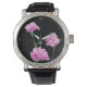 3 vivid carnation like pinks arranged against a black background and formal clock numerals.