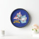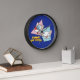 The size of the clock is dramatic and the abstract alcohol ink design is soothing and intricate at the same time. I chose the black frame that adds pop to the blue and gold design. The gold printing would be better in a slightly darker or larger font. I love it and I’m looking for just the right place in ny new apartment. I would recommend this clock for a personal gift or a present. I feel that the quality is excellent for the money! I’m a bit of a clock nut so I’m pretty particular about my purchases. The clock is larger in diameter than many if the clocks I have, so it stands out very well. I think a slightly darker printing color and a moderately larger size would best suit a professional decor or add more impact in a work place item.