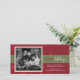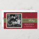 The contemporary design on this photo card is appropriate for any holiday whether for Christmas, Hanukkah or Kwanzaa. The crimson red background with graphic snowflakes and swirls gives a modern flair to your main holiday message spelled out on an emerald green ribbon. Customise with your own message and photograph. Available in alternate colours with matching products.