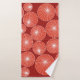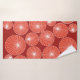 This towel set has a mid-century modern design of red circles with white starbursts in them, all on a field of brick.