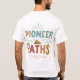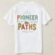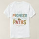 t-shirt design features the text "Pioneer Paths" in a playful, cartoon font, with colourful wagon wheels and trail signs in the background. This lighthearted and fun-loving design is perfect for anyone who appreciates the spirit of adventure and discovery.