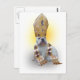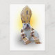 Shown is a photographic image of a white english bulldog wearing a cardinal's mitre.