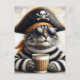 Pirate cat in fuzzy sweater with a coffee postcard