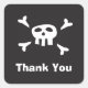 Kids pirate birthday party favour seals/stickers featuring a white cartoon skull on a black background and the customisable text "Thank you".