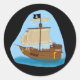 Unique and original pirate ship with skull and crossbones flag waving n the air while sailing out to sea. Illustration created by Kirsten Edwards of Hinterland Harmony. See this design on t-shirts, stickers, cards, postage stamps, mugs, Keds Shoes and more!