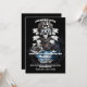A striking 3D ai watercolor graphic of a skull fitted to a metal post. It is surrounded by a black background and has blue ocean waves lapping up against it on which a pirate ship can be seen. The skull has diamonds for eyes and has a spooky appearance. Editable white templates for your custom wording appear below the illustration which is ideal for adults and teens hosting an ahoy matey pirate themed nautical party.