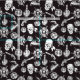 White graphics of skulls & pirate elements on black background, seamless repeat pattern