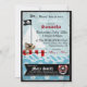 Fun pirate teddy bear with ship sailing on rough ocean water invitation card design for a baby shower.